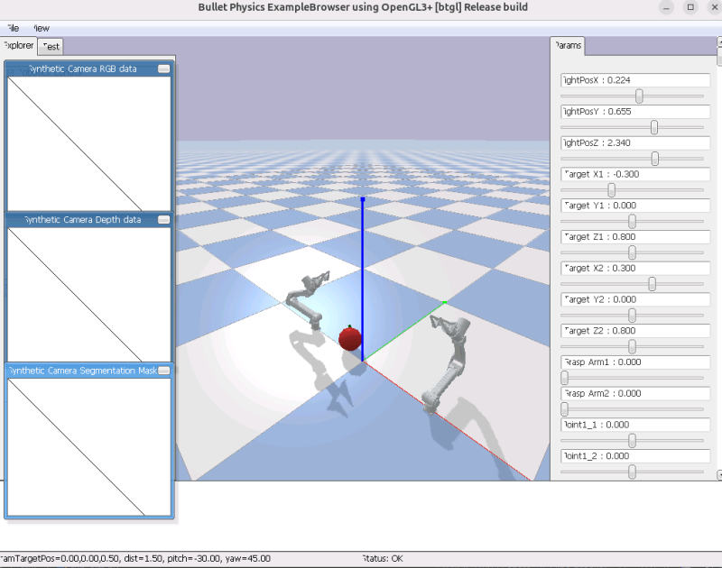 print("Starting simulation. Use the sliders to control the arms and grasp objects.")